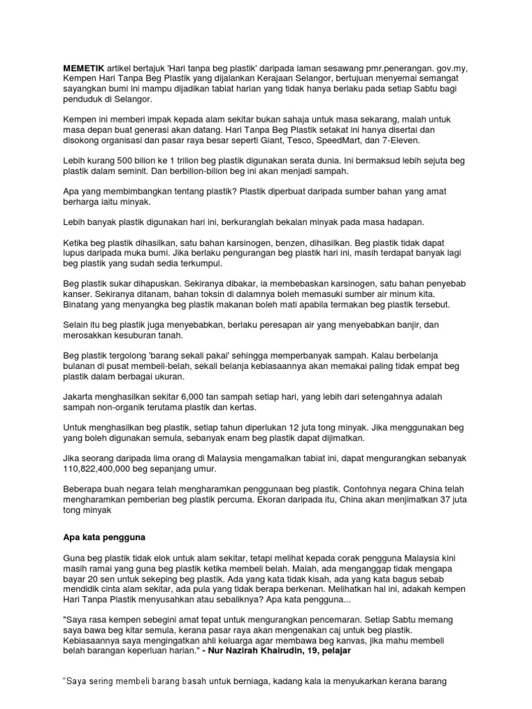 Wadah Keterampilan Berbahasa Rencana Umum Kepentingan Kempen Hari Tanpa Beg Plastik Polisterina